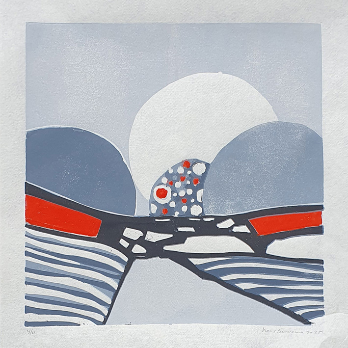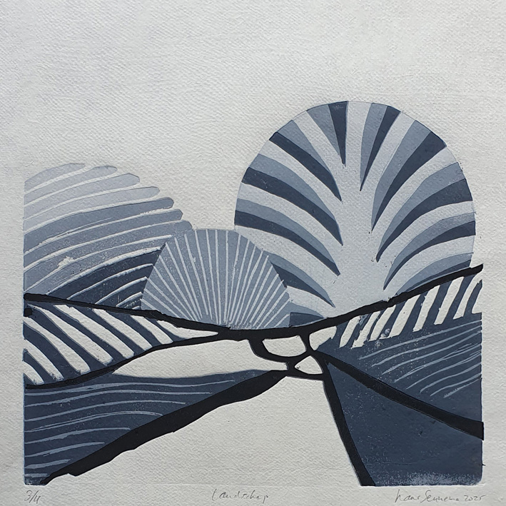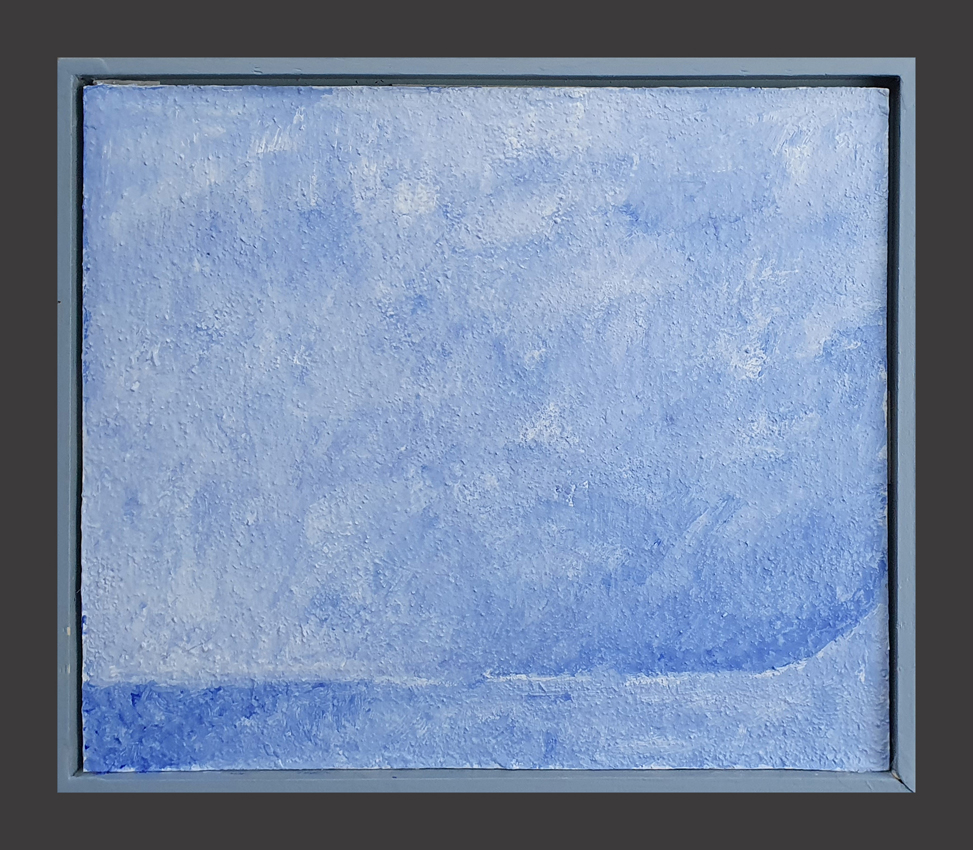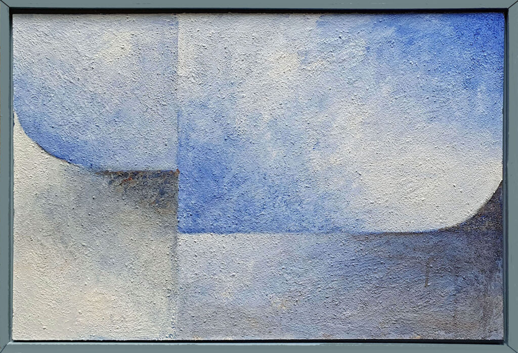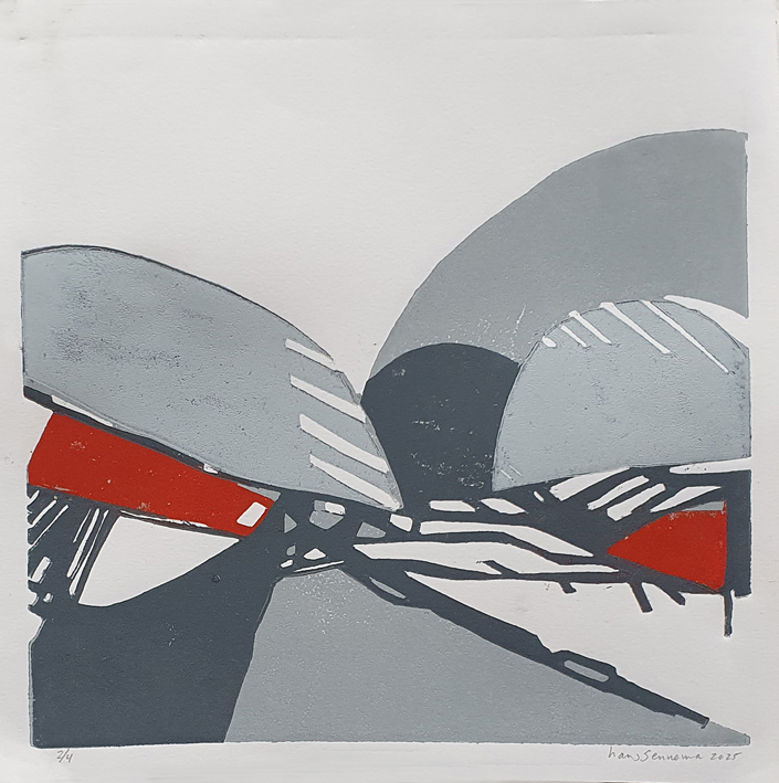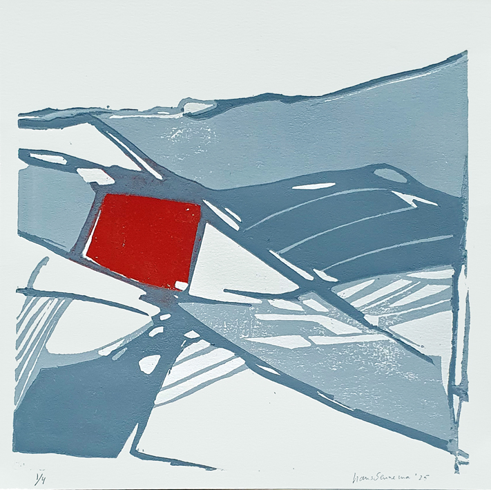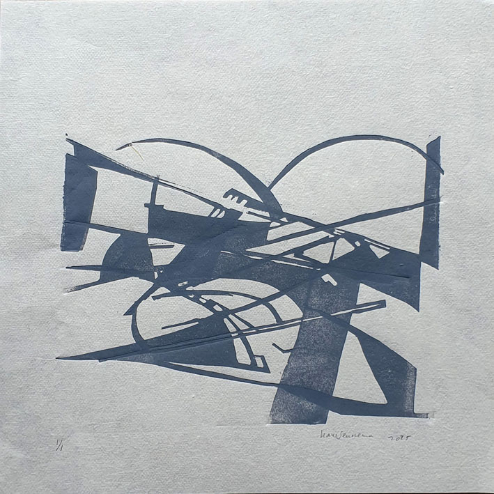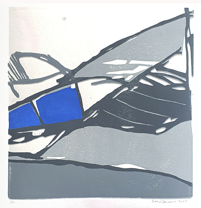 Ik heb tijdens mijn docentschap de zomervakanties doorgebracht in Frankrijk om daar elke dag een aquarel te maken. Die aquarellen zijn aanleiding geworden om een groot aantal daarvan om te zetten in grafiek, Daarvoor gebruik ik ipv linoleum liever mdf, dat werkt voor mij beter. Nu roepen deze druksels niet direct een Frans sfeer op. Ik heb ze dan ook meer bedoeld als een onderzoek naar mogelijkheden naar effecten die het materiaal en een beperkt aantal kleuren kan oproepen met betrekking tot ruimte. Voor de schilderijen geldt hetzelfde, ze zijn gemaakt met de kleuren ultramarijn, cobalt blauw en wit. Compositie is voor mij heel belangrijk.