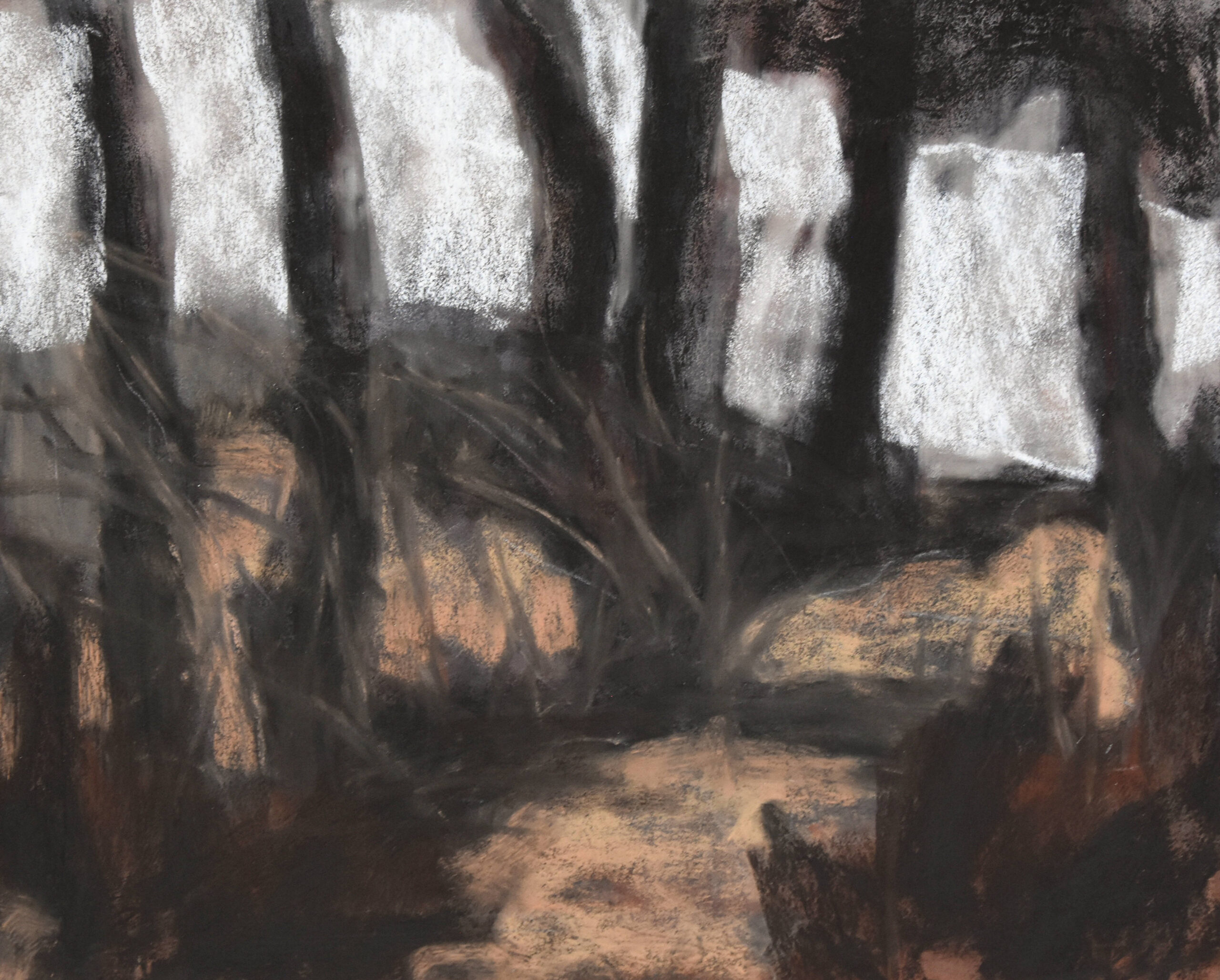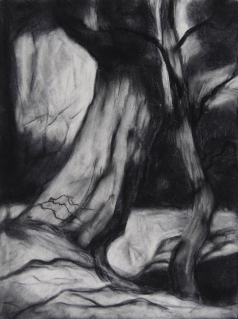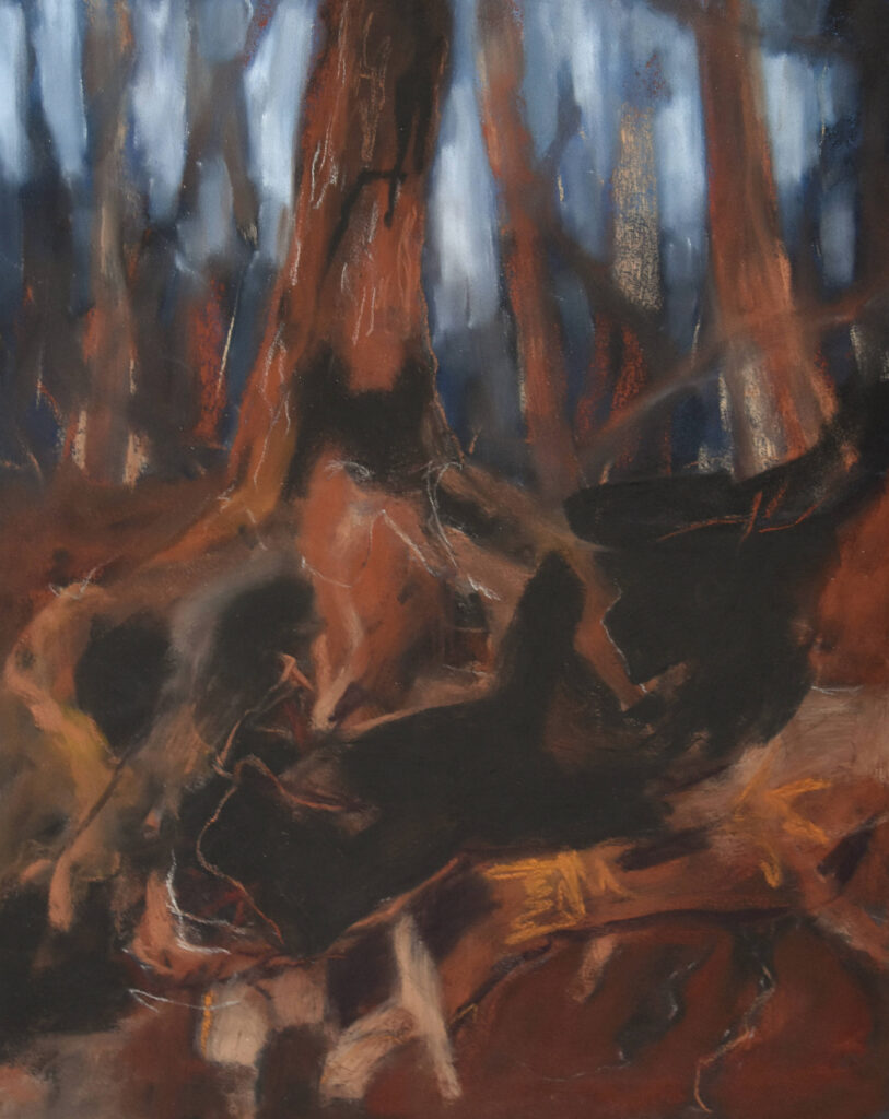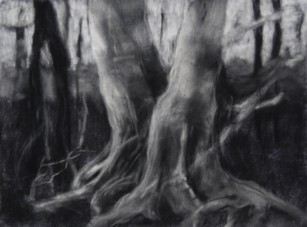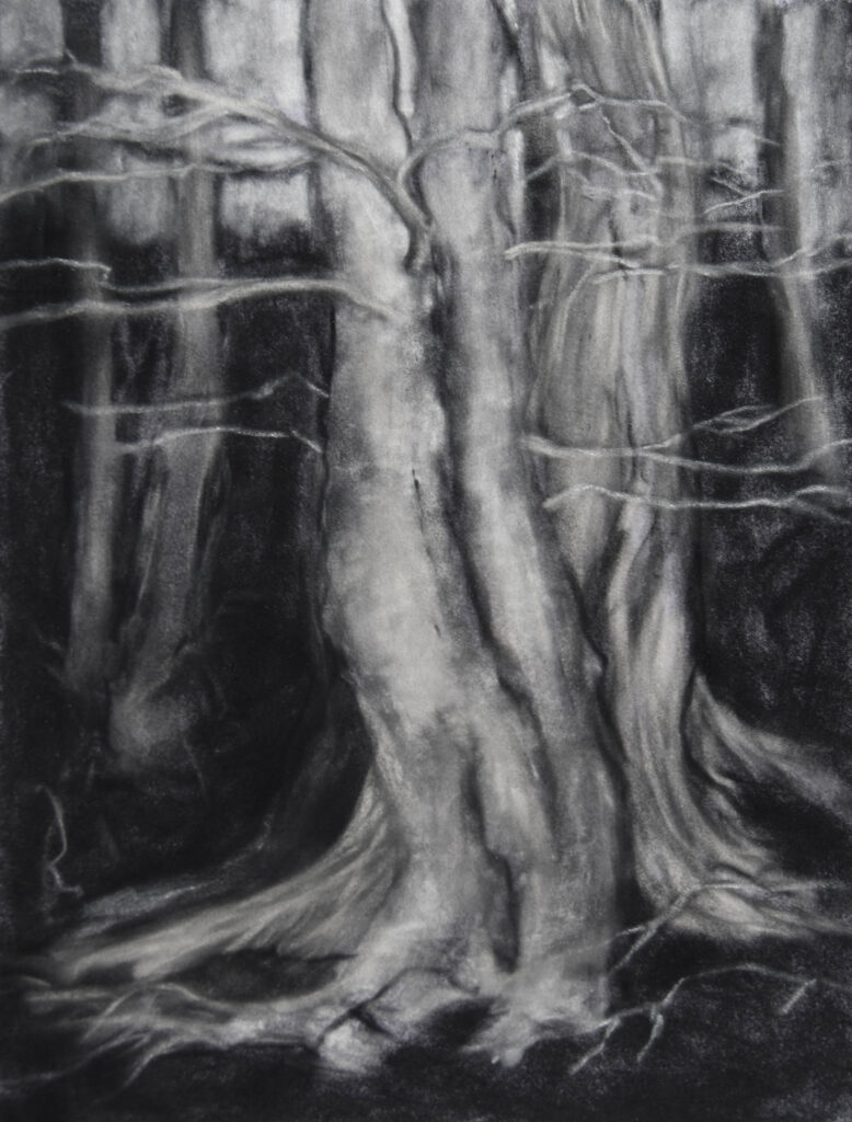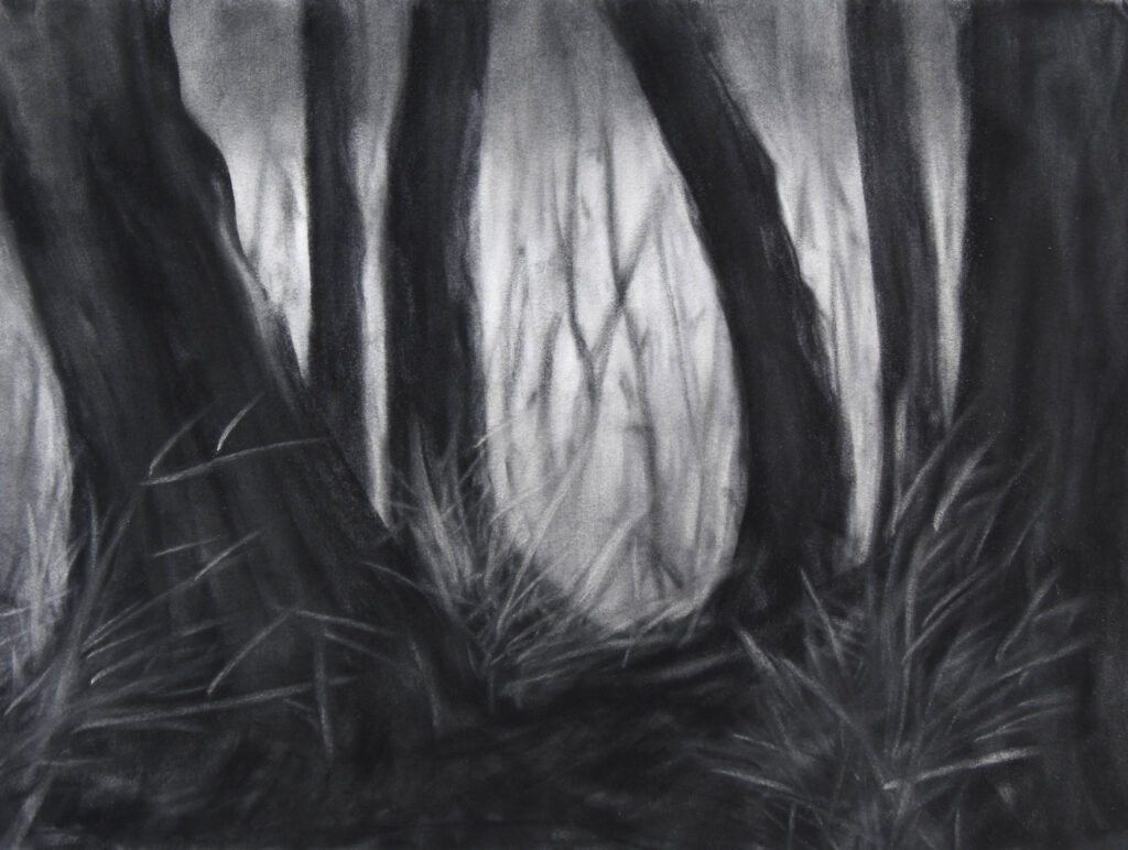 Een bos kan een gevoel van geborgenheid bieden, maar ook angst oproepen, gevaar betekenen. Je ziet in het bos de cyclus van het leven en je voelt je er deel van een groter geheel. Dit alles probeer ik weer te geven met verschillende technieken. De laatste tijd vooral in tekeningen met houtskool of pastel, materiaal waarmee je goed de ‘dromerigheid’ van een bos kunt weergeven.