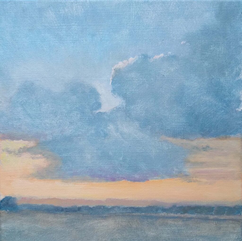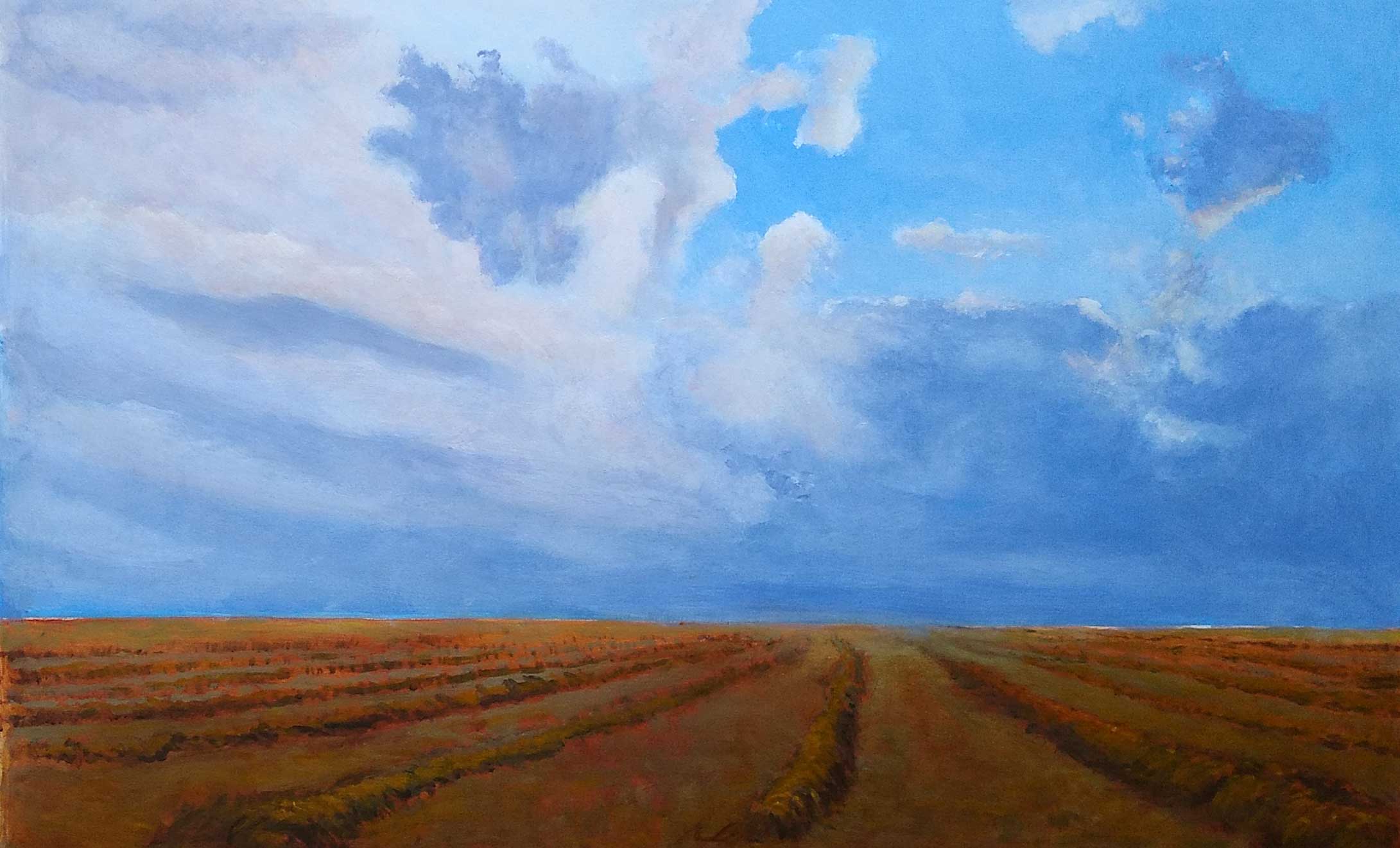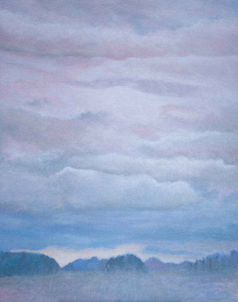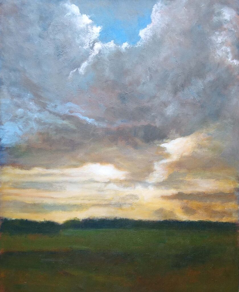 In mijn schilderijen is het landschap een plek om even stil te staan. Het is geen letterlijke weergave van een locatie, maar een ruimte waarin je kunt verblijven. De horizon geeft houvast. De lucht daarboven echter is steeds in beweging. Mijn aandacht gaat uit naar de wolkenluchten. Wolken bepalen het licht en de sfeer van het moment. Ze brengen rust of spanning en maken verandering zichtbaar. Ik werk doorgaans in lagen en neem de tijd om het beeld te laten ontstaan.