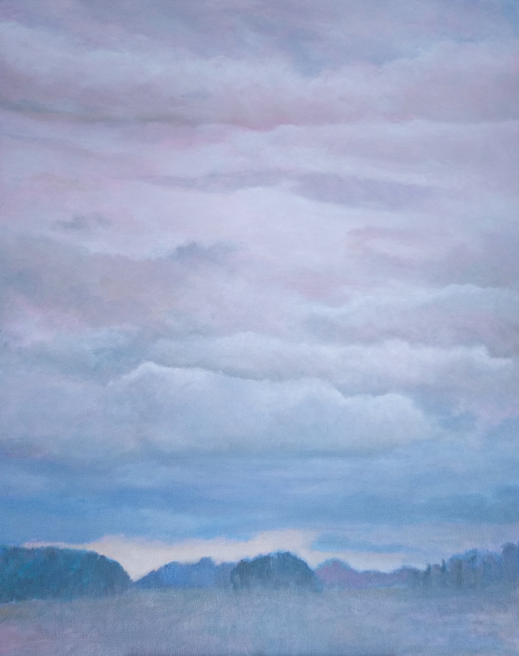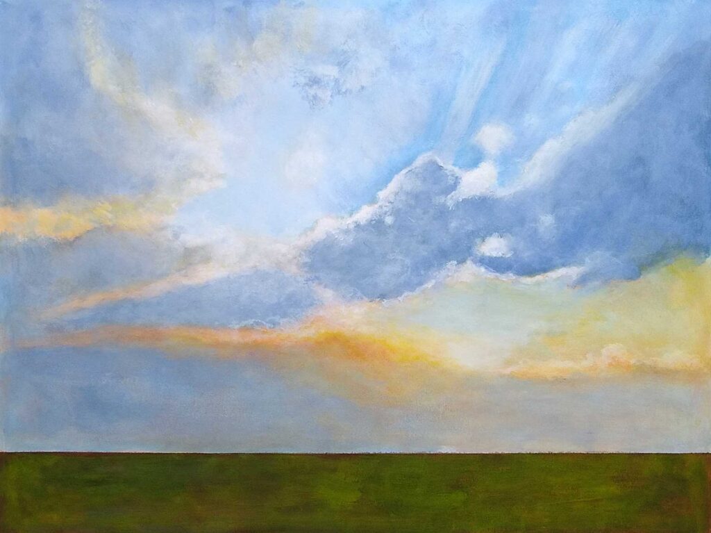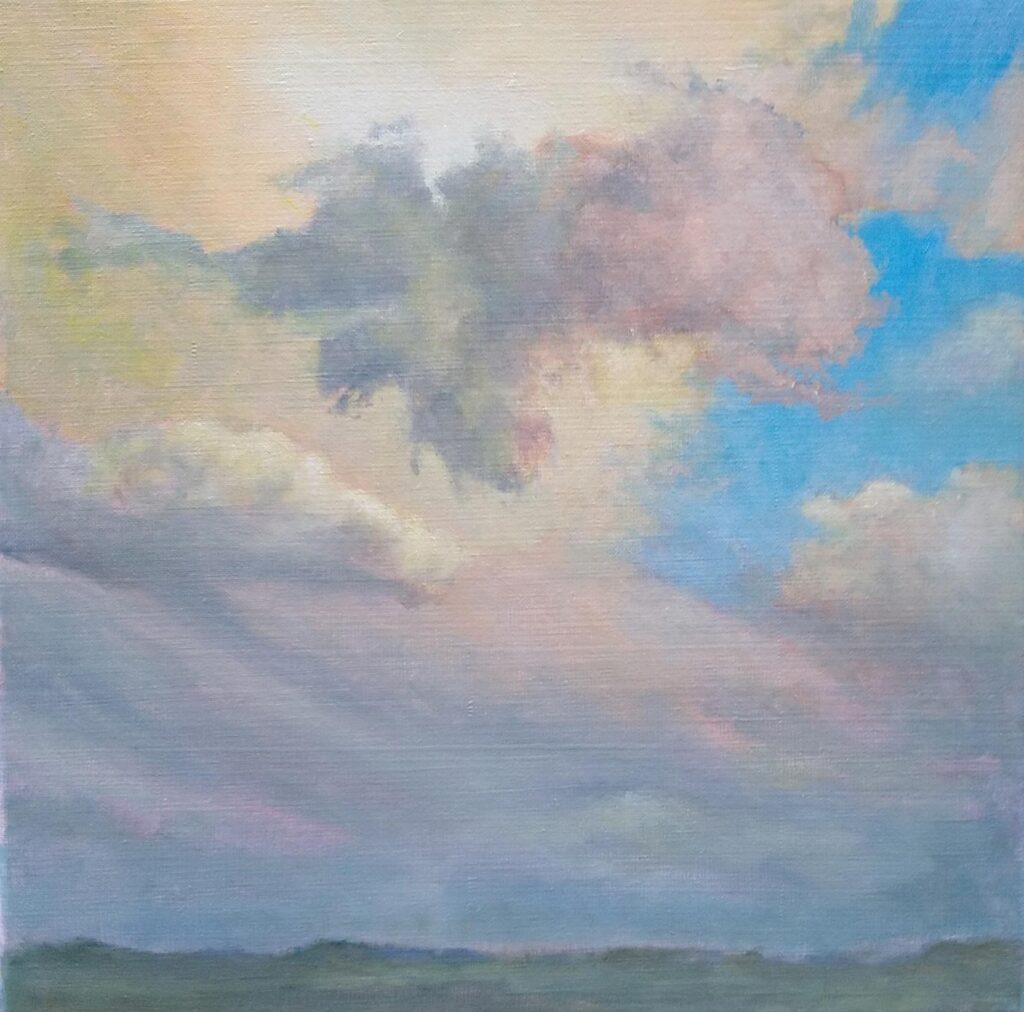 In mijn schilderijen is het landschap een plek om even stil te staan. Het is geen letterlijke weergave van een locatie, maar een ruimte waarin je kunt verblijven. De horizon geeft houvast. De lucht daarboven echter is steeds in beweging. Mijn aandacht gaat uit naar de wolkenluchten. Wolken bepalen het licht en de sfeer van het moment. Ze brengen rust of spanning en maken verandering zichtbaar. Ik werk doorgaans in lagen en neem de tijd om het beeld te laten ontstaan.